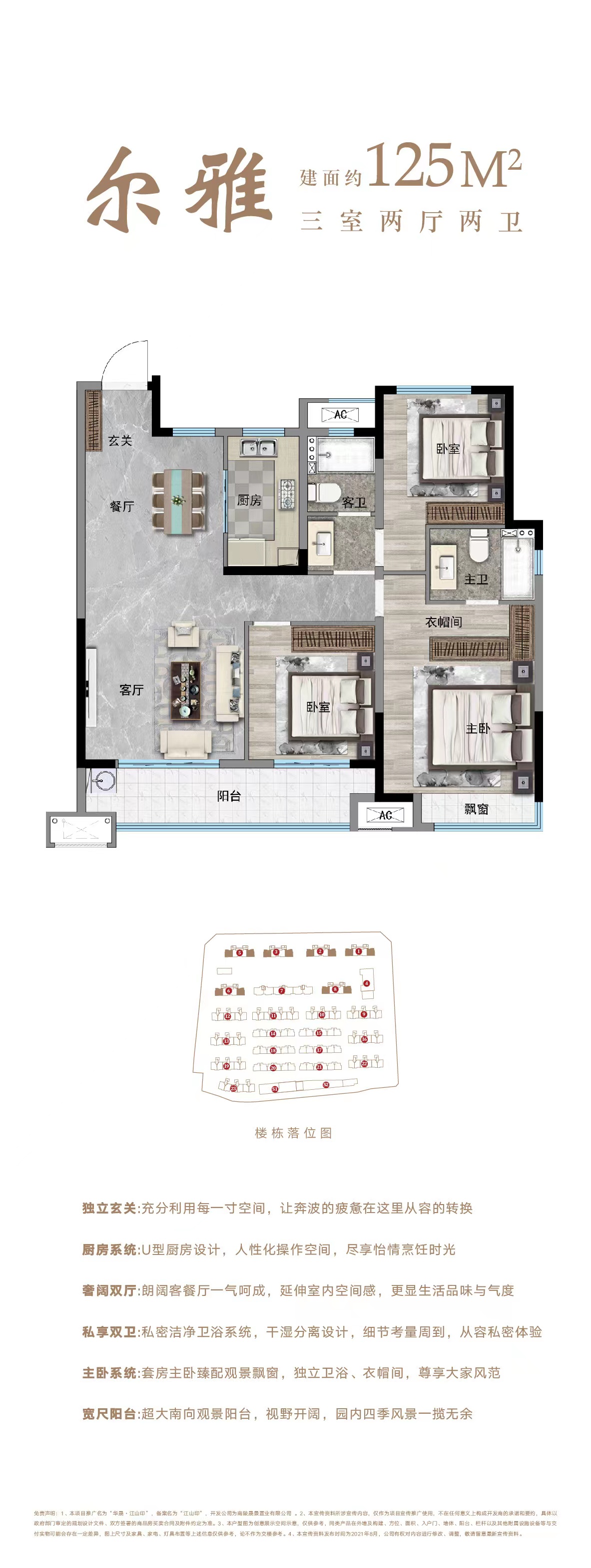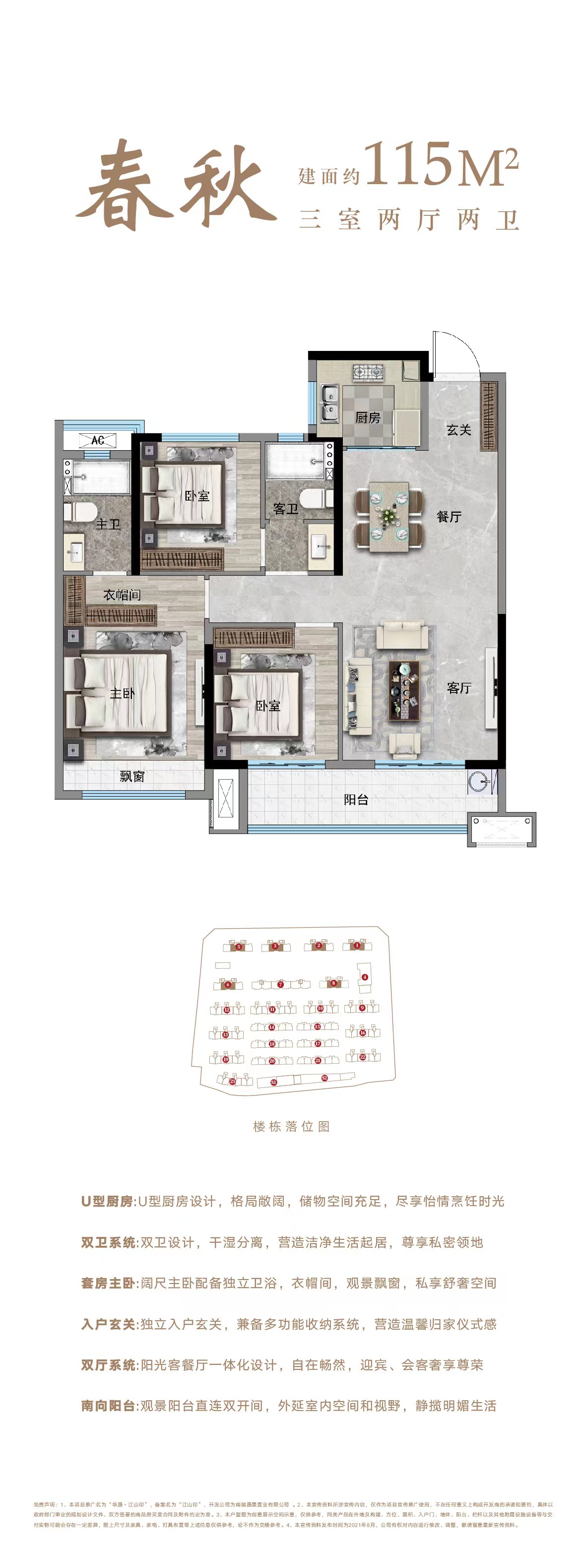 U型厨房:U型厨房设计,格局敞阔,储物空间充足,尽享怡情烹饪时光 双卫系统;双卫设计,干湿分离,营造洁净生活起居,尊享私密领地 套房主卧;阔尺主卧配备独立卫浴,衣帽间,观景飘窗,私享舒奢空问 入户玄关;独立入户玄关,兼备多功能收纳系统,营造温馨归家仪式感 双厅系统;阳光客餐厅一体化设计,自在畅然,迎