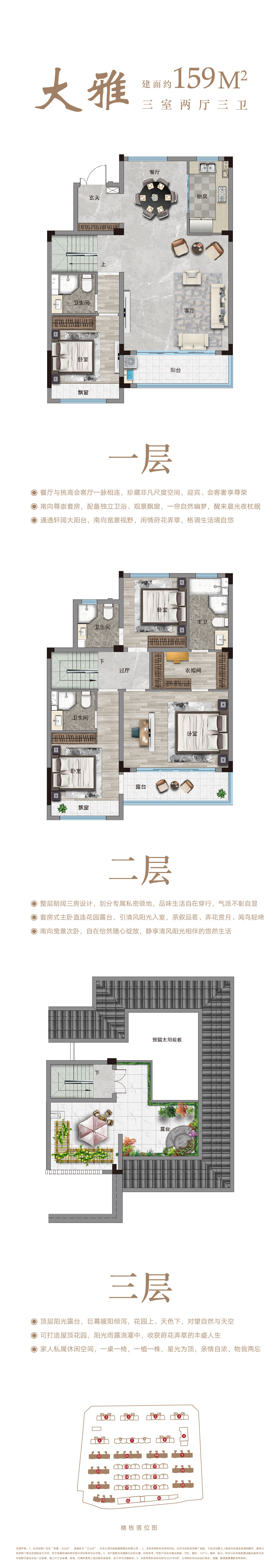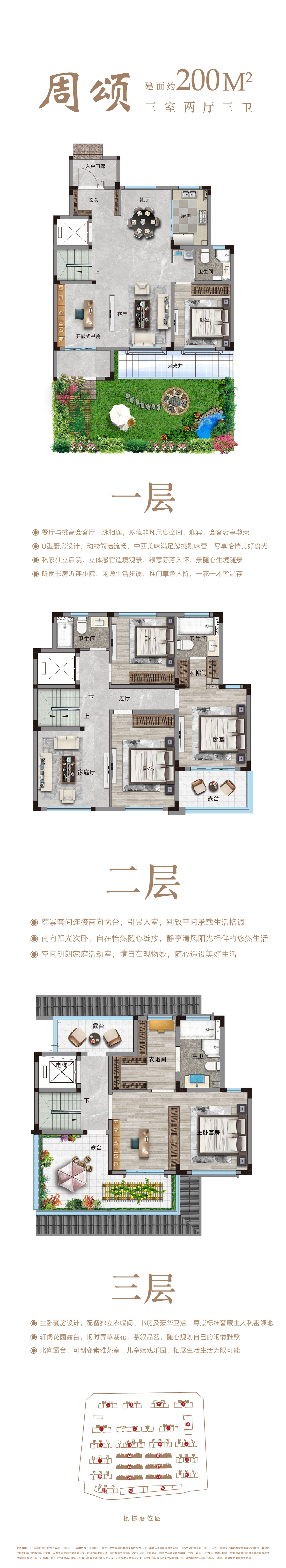 一层 餐厅与挑高会客厅一脉相连,珍藏非凡尺度空间,迎宾、会客奢享尊荣南向尊崇套房配备独立卫浴、观景飘窗,一帘自然幽梦,醒来晨光夜枕通透轩阔大阳台,南向宽景视野,闲情莳花弄草,格调生活境自悠 二层 整层朗阔三房设计,划分专属私密领地,品味生活自在穿行,气派不彰自套房式主卧直连花园露台,引清风阳光入室