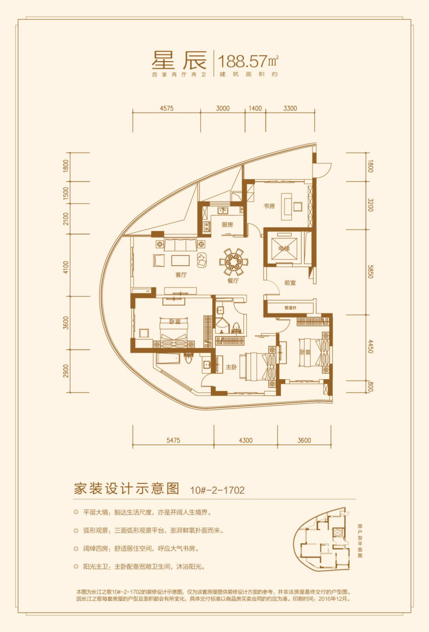 平层大境:豁达生活尺度;弧形观景:三面弧形观景平台;阔绰四房:舒适居住空间;阳光主卫:主卧配备宽敞卫生间。